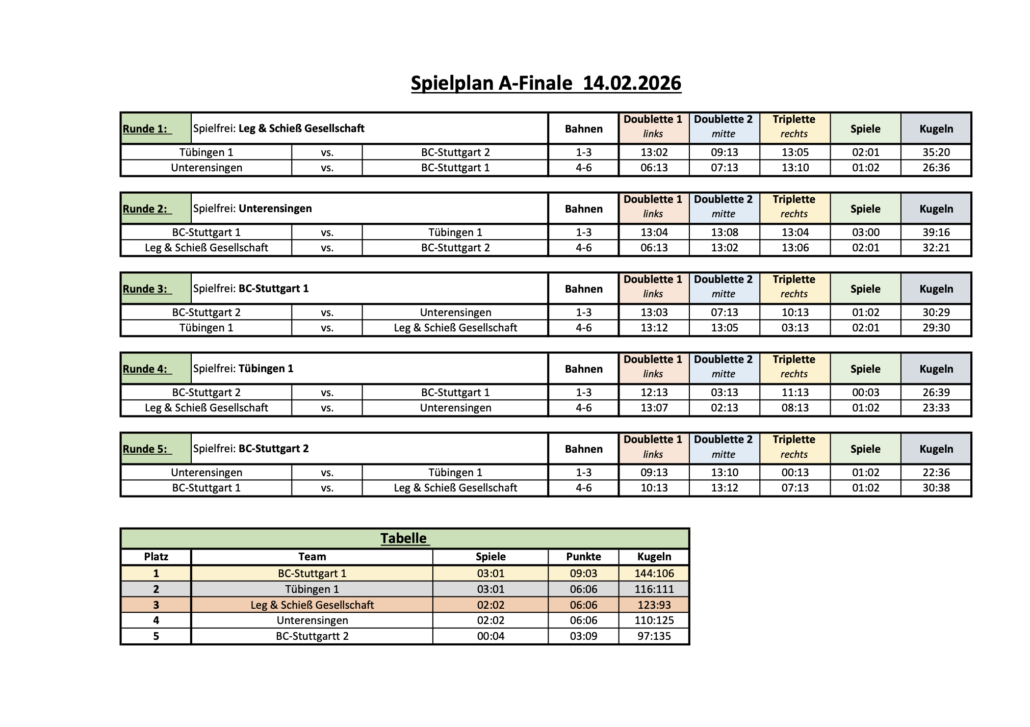 Zum Ende des Tages spitzte sich dann die ohnehin schon prekäre Personalsituation der ersten Mannschaft weiter zu, sodass Hugo und Bea das Triplette gegen die Leg & Schießgesellschaft aus Pfullingen ab der 4. Aufnahme zu zweit bestreiten mussten. In dieser Unterzahl-Situation mussten sich die beiden am Ende leider mit einem respektablen 7:13 geschlagen geben. Auch Lukas und Felix konnten ihr Doublette leider nicht für sich entscheiden, sodass sich nur Nina und Aaron nach einem spannenden Spiel zu 12 einen verdienten Sieg sichern konnten. Mit einem Endergebnis von 1:2 musste der BCS 1 damit im letzten Spiel seine einzige Niederlage des Tages einstecken.