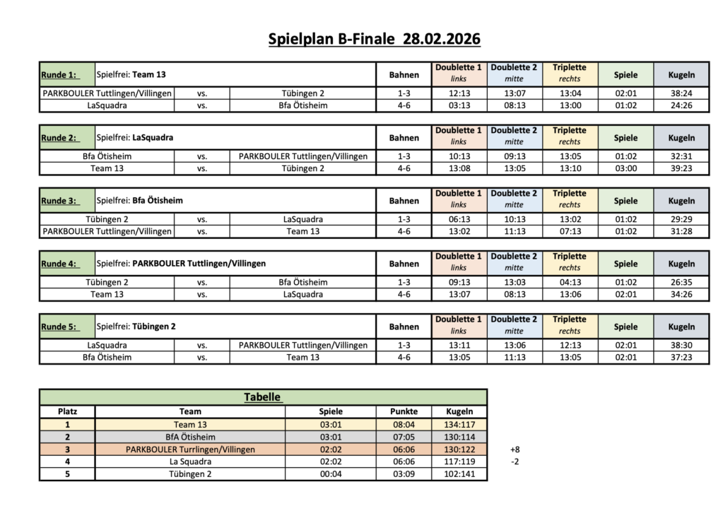 Mit einem Spitzenduell zwischen Team 13 und Ötisheim, die jeweils um den Sieg spielten, ging der Tag schließlich ebenso spannend zu Ende, wie er sich zuvor bereits angedeutet hatte. Wie schon im A-Finale, musste sich auch hier die einzige bis dahin ungeschlagene Mannschaft, das Team 13, schließlich geschlagen geben und machte es damit noch einmal richtig spannend: Gleich zwei Mannschaften mit 3:1 am Ende dieses Spieltages – so kam es schließlich auf das Spielverhältnis an, bei dem sich Team 13 mit 8:4 im Vergleich zu Ötisheim mit 7:5 durchsetzen konnte.